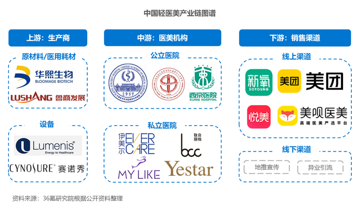 产业链结构:由上游生产商、中游医美机构及下游销售渠道构成