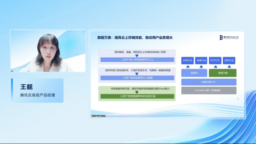 会上,腾讯云存储高级产品经理王靓提到,腾讯云数据万象打造了“存+管+数据处理”一站式生产力平台,大幅降低了用户的研发成本和使用门槛,其还聚焦电商、文创、生活互联等行业场景做出了能力优化,进一步帮助用户提高生产力。