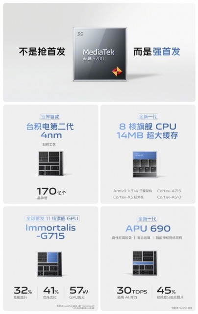 配置方面,vivo X90全球首发联发科天玑9200芯片,采用台积电第二代4nm工艺,全新一代8核旗舰CPU,集成天玑最强旗舰11核GPU Immortalis-G715,第六代旗舰APU高性能高能效AI架构。除了天玑9200外,该机还搭载了vivo自研芯片V2,将多达19种王牌影像算法写入芯片内核,全新升级的AI-NR降噪、HDR影调融合、MEMC插帧等算法,全面增强影像及显示效果。影像方面,该机前置了3200万像素自拍镜头,后置5000万主摄IMX866+1200万超广角+1200万专业人像镜头,电池为4810mAh,支持120W有线闪充。