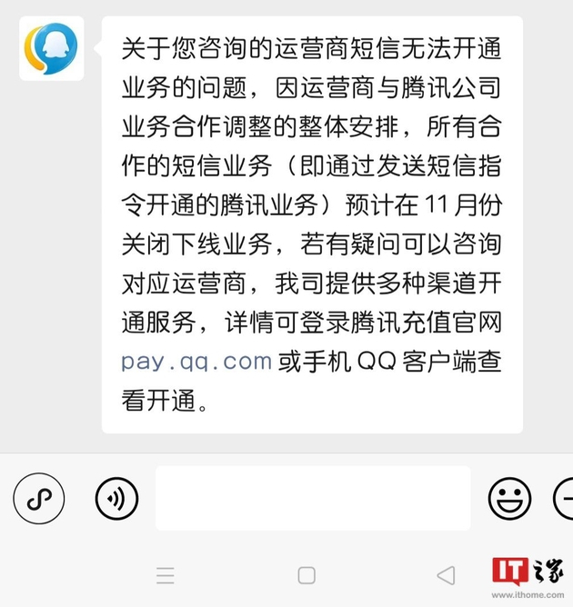 IT之家 12 月 2 日消息,据腾讯客服消息,因运营商与腾讯公司业务合作调整的整体安排,所有合作的短信业务(即通过发送短信指令开通的腾讯业务)预计在 11 月份关闭下线业务。