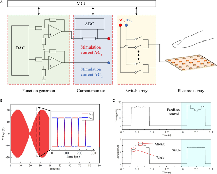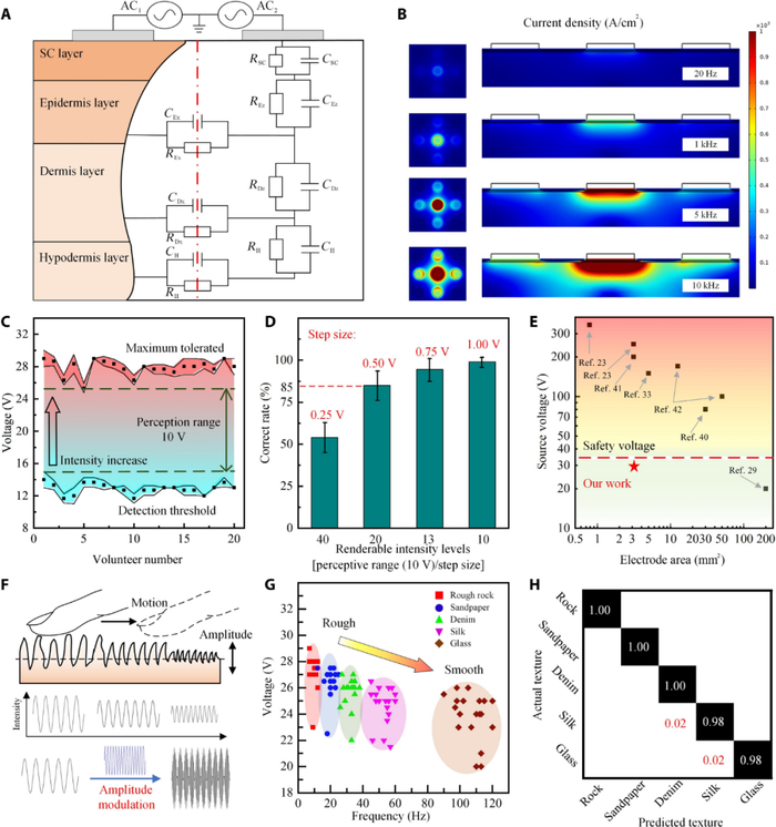 研究者同时采用了参数相同、相位差 180 度的两个交流电进行同时输出,进一步增强触觉。基于这种双高频交流电策略,志愿者测试表明 13V(检测阈值电压)到 28V(最大耐受电压)之间的刺激电压足以产生从轻微触摸到尖锐刺痛的不同触觉。