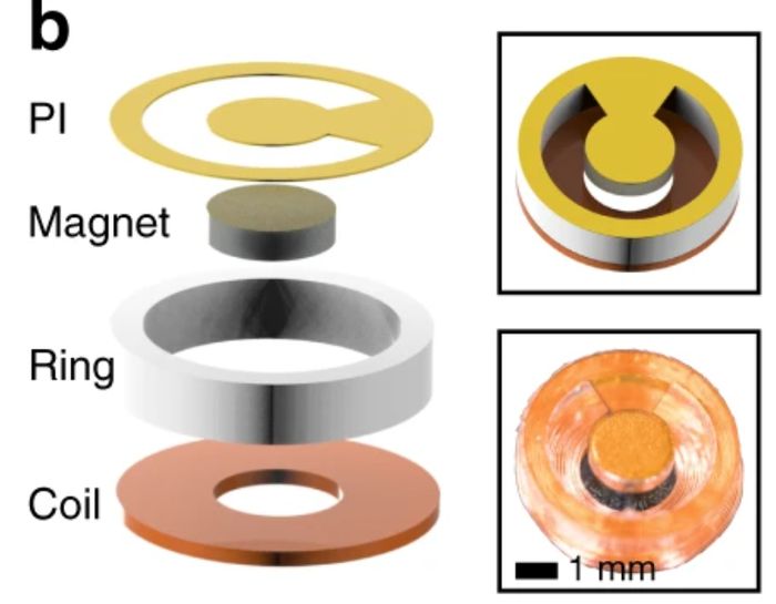 在与香港城市大学、大连理工大学等高校合作的论文《Miniaturization of mechanical actuators in skin-integrated electronics for haptic interfaces》中,研究者进一步缩小电磁执行器的尺寸,直径为 5mm,并保持强烈的震动。论文已被 Microsystems & Nanoengineering 收录。电磁驱动器应用在具有触觉反馈功能的电子皮肤的时间较晚,所以目前还没有商业公司生产此种类型的电磁执行器。