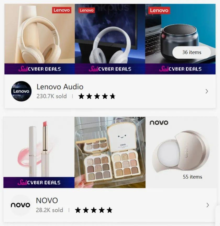 三是Temu引进品牌卖家和跨境大贸易商,流量也对平台内的大店和品牌有所倾斜。最近官方表态入驻Temu的易佰网络,就是业内有名的贸易型跨境电商,而在Temu平台推荐的店铺列表中,还能看到Lenovo(联想)和国货彩妆品牌NOVO的店铺。