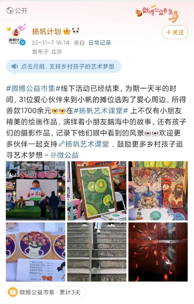 双十一期间,微公益发起#微博公益市集#话题活动,联合@中国绿化基金会@中国社会福利基金会@扬帆计划 等20多家公益机构分享创意满满、精美有爱的项目周边,在微博打卡7天“出摊”,晒出周边好物,讲述公益周边背后的暖心故事,吸引超3500位微博网友共同参与打卡活动。话题阅读量2250万+。