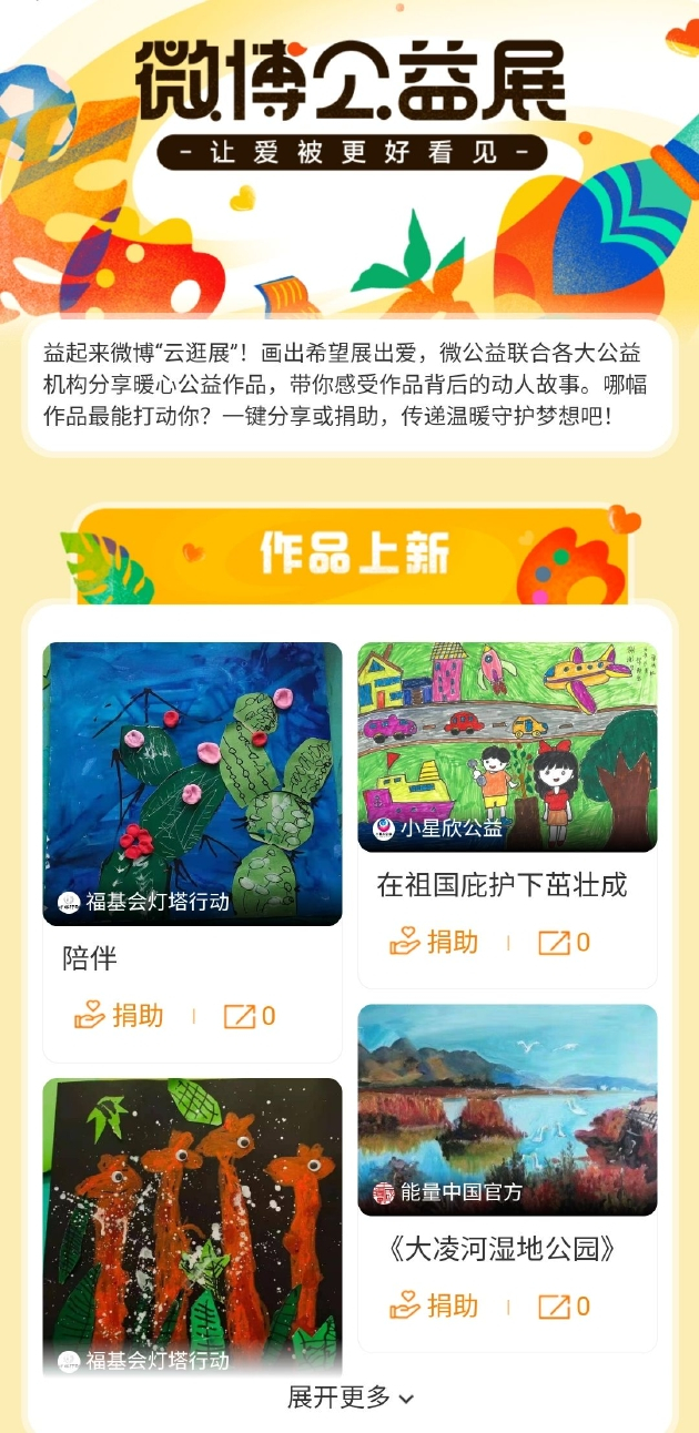 “云逛展”日益兴成为一种新的生活方式。@微公益 上线#微博公益展#产品专题页,联动@中国乡村发展基金会@美丽中国@扬帆计划 等数十家机构分享优质作品,旨在通过线上展览的形式,呼吁网友关注乡村儿童教育、关爱特殊群体、守护野生动植物、保护非遗文化等公益内容,以打动人心的作品传递其背后的动人故事,让爱被更好地看见。话题阅读量超4000万。
