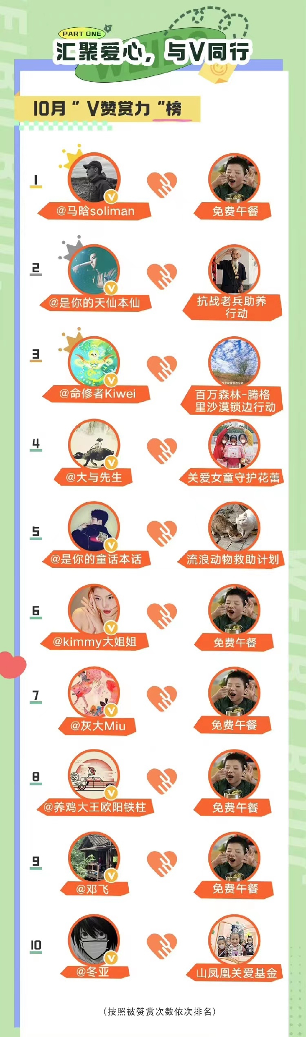 近日,@微公益 联合@微博打赏 发布#公益赞赏# V赞赏力10月月榜及11月周榜,并联动@免费午餐@中华救助 等8家机构,@马晗soliman等20+大V发博感谢微博爱心网友的支持。截至11月30日,大V累计开通6500多人,累计被赞赏次数30000多次。
