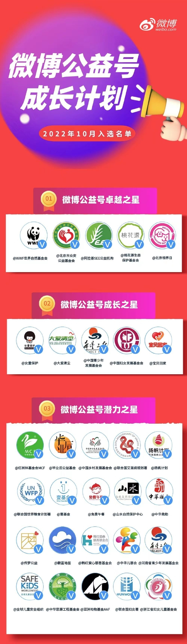 近日,微公益发布入选2022年10月份#公益号成长计划#账号名单,联动入围公益号,通过话题高级模块、曝光资源位、大数据多种形式支持公益号公益项目传播和公益理念倡导。
