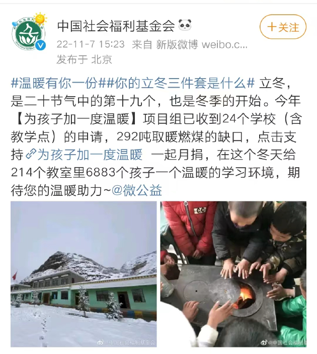 进入十一月,立冬节气的到来预示着寒冬的正式来临。当日,@微公益 联合@中国天气 邀请@壹基金@扬帆计划 等数十家公益机构晒出独家过冬装备——“立冬三件套”,为即将到来的寒冬风雪储备一份善意与温暖。小雪节气,@微公益 联合@中国天气 邀请@中国社会福利基金会@叶柏公益基金 等20+公益机构分享身边的温暖故事,与微博网友携手传递温暖,让这个冬天不再寒冷。相关话题阅读总量1亿+。