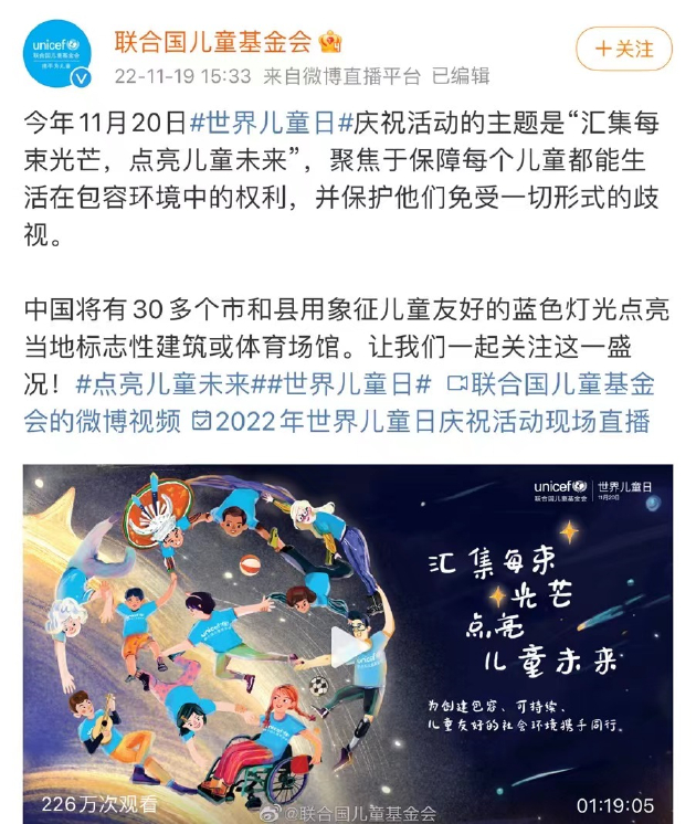 11月20日是#世界儿童日#,@微公益#V爱护苗计划#联动众多公益机构发起节日活动,联动名人大V共同为儿童发声。其中,微公益携手@联合国儿童基金会 发起专属相框活动,邀请@陈坤 等名人大V分享照片,呼吁点亮儿童未来;当天庆祝活动直播连线中国30多个市和县,观看量达226万+。并联合@中国社会福利基金会 发起#冬日暖流温暖开餐#活动,联动微博公益合伙人@旅游约吗@蘸盐、明星@顾璇@王艳 等,一起守护儿童吃好穿暖。