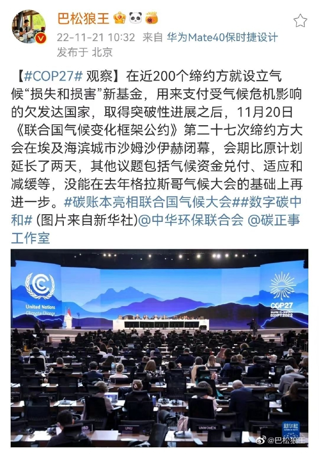 11月6日,“联合国气候变化框架公约第27次缔约方会议”#COP27#于埃及滨海城市沙姆沙伊赫正式拉开帷幕。在两周会议期间,@微公益@微博环保 联合@环球网评论,邀请@巴松狼王@生态梦人@公众环境马军@张立教授@陶岚kathy@中华环保联合会@中国环境@碳正事工作室 担任COP27观察团,全程追踪报道本次大会动态。@微博环保 持续输出观察团会议见闻日报,分享最新进展,呼吁网友关注气候问题。话题总阅读量1.2亿+。