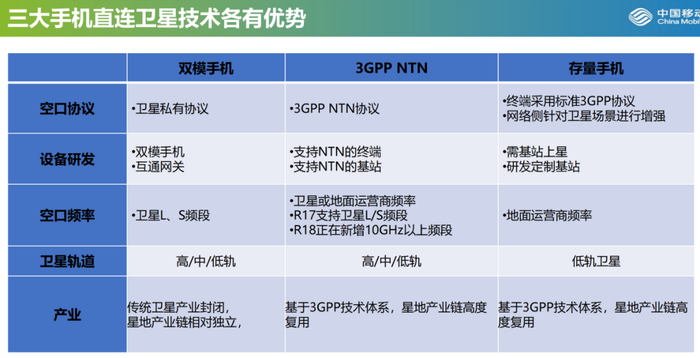 马克指出,三大手机直连卫星技术各有优势,双模手机直连卫星技术可快速落地,但产业链相对独立,技术演进缓慢;3GPP NTN技术商用进程较晚,但基于统一的3GPP协议,星地产业链复用程度高。这两种技术都支持高、中、低轨卫星。存量手机直连卫星技术采用标准4G/5G终端,无需软硬件改动,但仅支持低轨卫星,基站侧需定制增强。