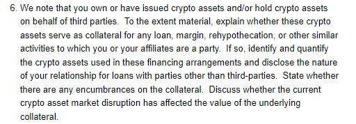 SEC的问题主要集中在交易对手方风险上,这些对手方可能是已申请破产、面临大量赎回或暂停客户提款的加密货币市场参与者。其中一个示例问题是:
