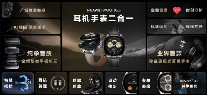 此次,历时三年的打磨和试验,推出的全新品类产品华为WATCH Buds,将TWS耳机与手表合二为一,打造出业界首款弹盖磁吸式耳机手表,不仅为用户带来更加便利的使用体验,也将华为持续不断的创新精神再一次闪耀在产品上。
