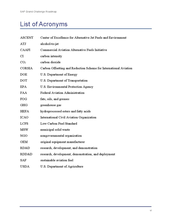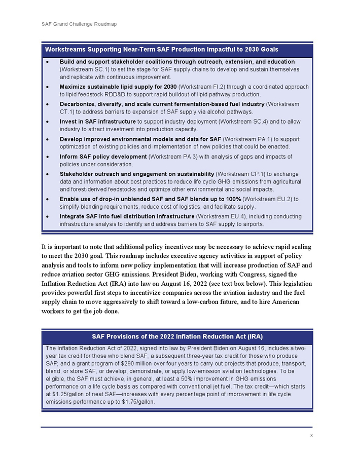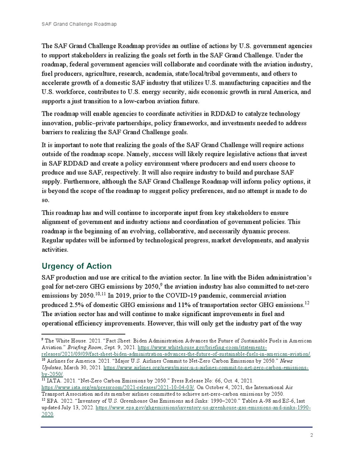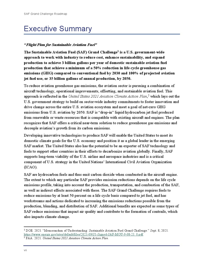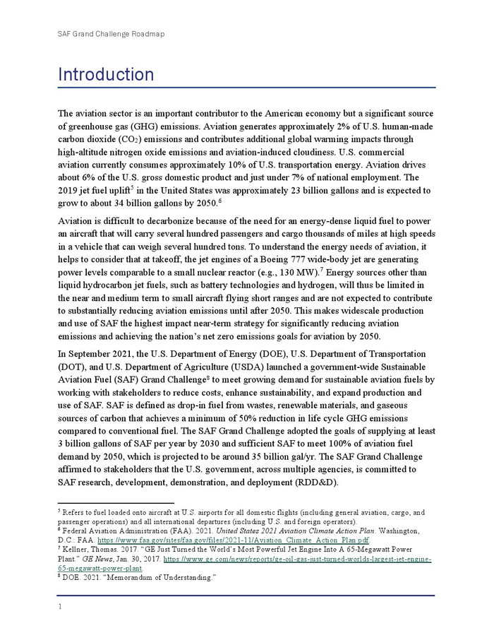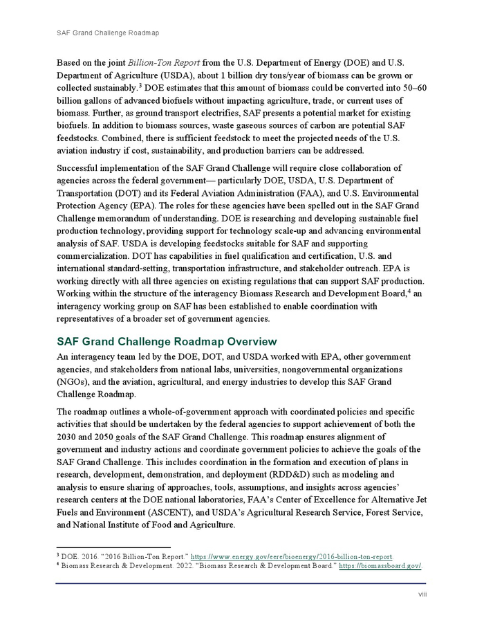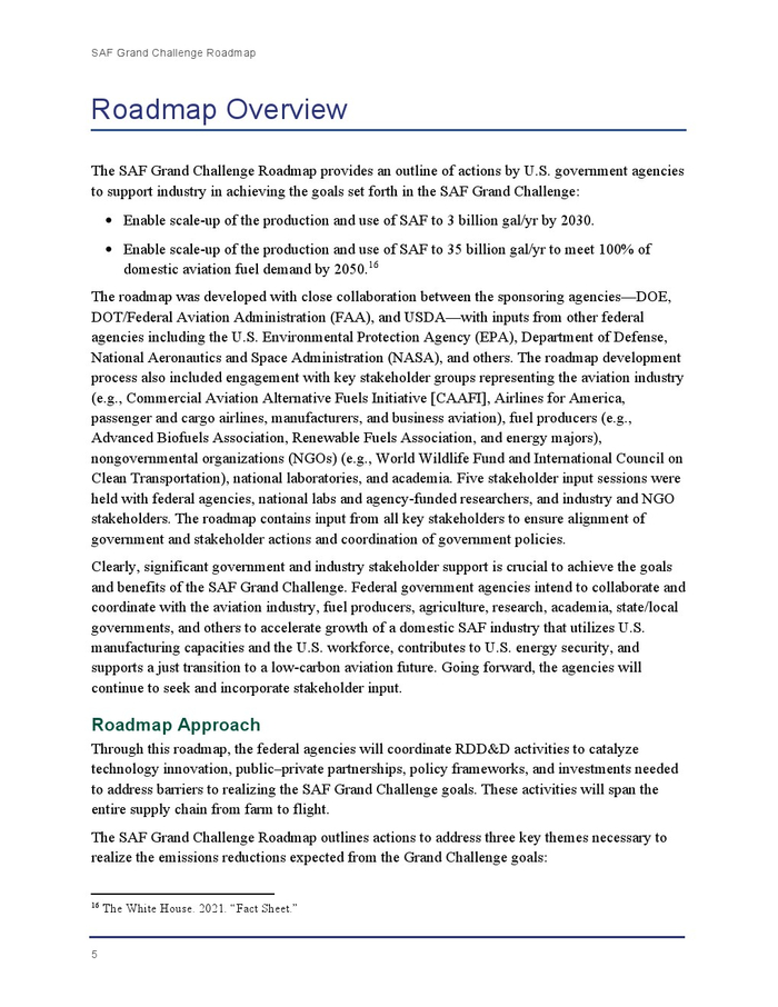 由DOE、DOT和USDA领导的跨部门团队与EPA、其他政府机构以及国家实验室、大学、非政府组织(NGO)以及航空、农业和能源行业的利益相关者合作,制定了SAF大挑战路线图。