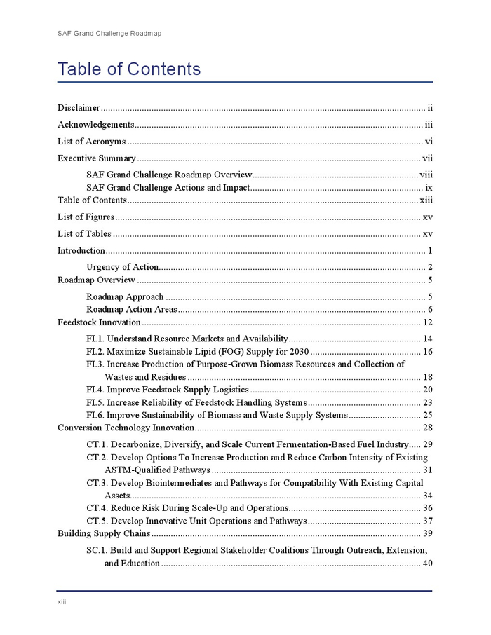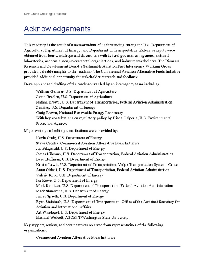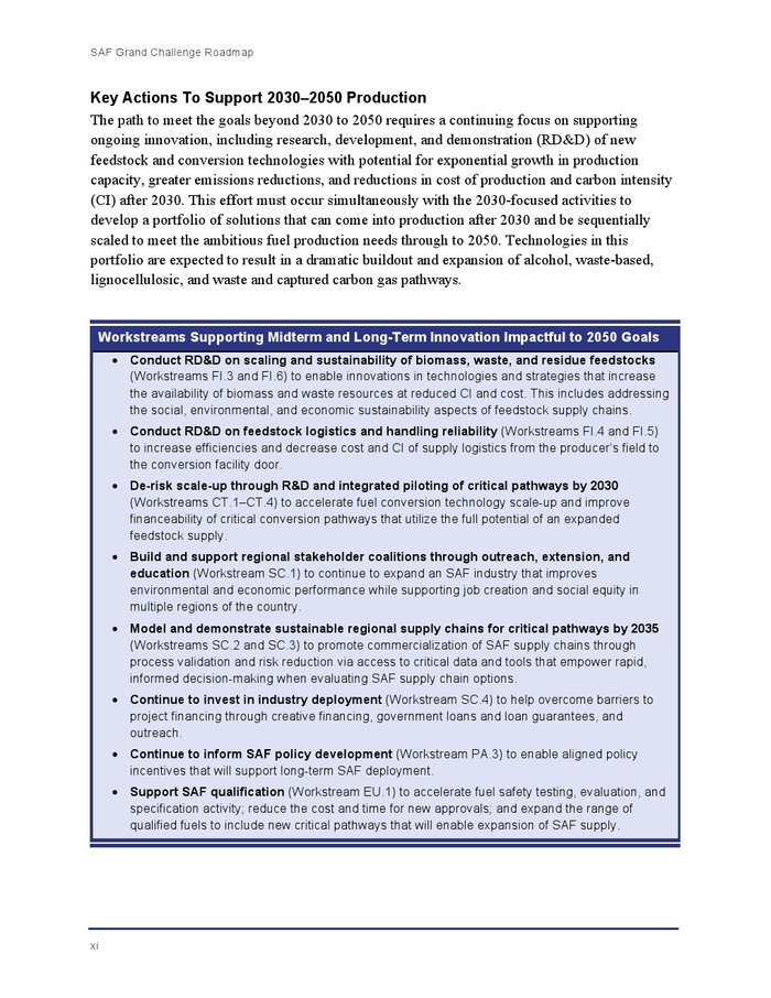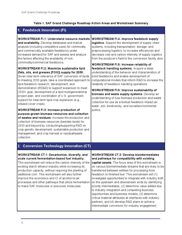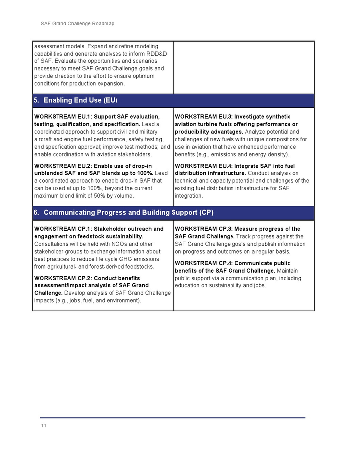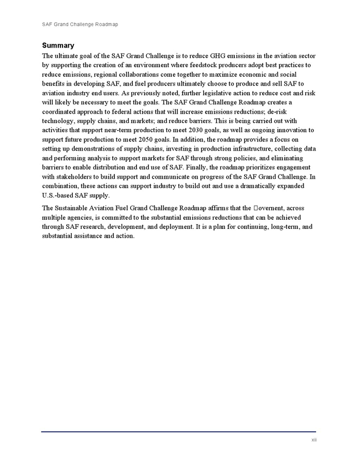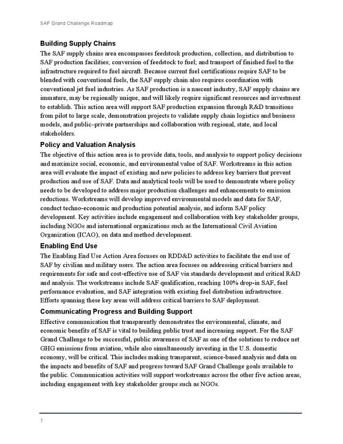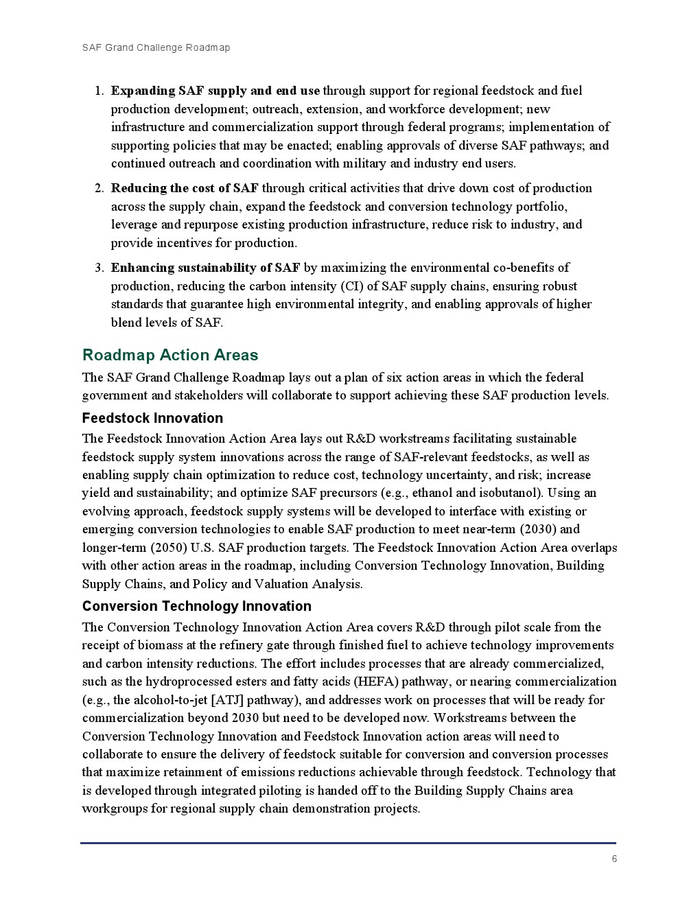 由DOE、DOT和USDA领导的跨部门团队与EPA、其他政府机构以及国家实验室、大学、非政府组织(NGO)以及航空、农业和能源行业的利益相关者合作,制定了SAF大挑战路线图。