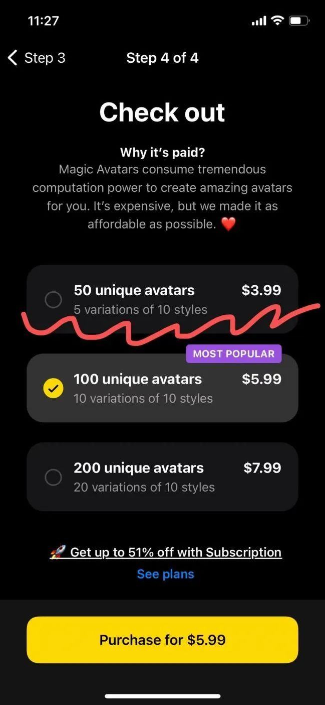 Magic Avatars 功能使用了今年 8 月份在 GitHub 上推出的免费开源 AI 绘画工具 Stable diffusion,用户上传至少 20 张脸部清晰的图片,就可以生成 10 种风格的 50 张 avatar 头像。要查看头像,用户需要支付 3.99 美元。