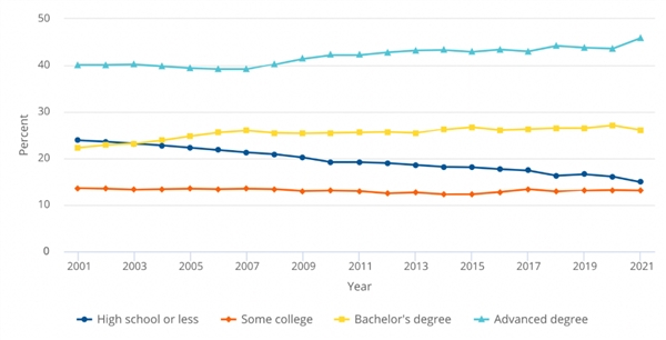 自2001年到2021年,获得博士学位的美国公民和永久居民中,白人比例从77%下降到了67%,亚裔则从7%增加至10%。