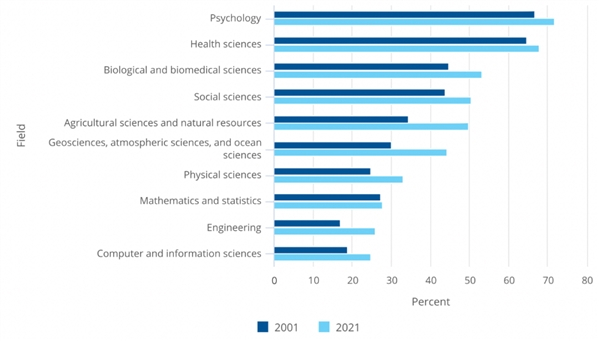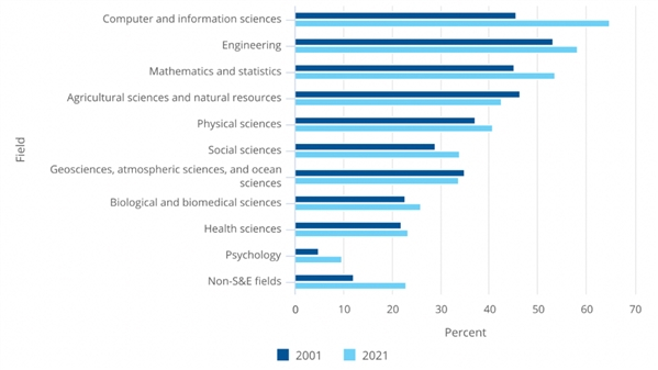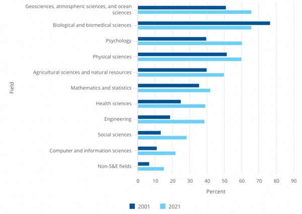 图表:过去20年间,在多数S&E领域,女性博士学位获得者的比例在增加。不过,在工程学、数学与统计学、计算机与信息科学、物理学、地球科学、大气科学和海洋学等领域中,女性占比较低,在25%到44%之间。