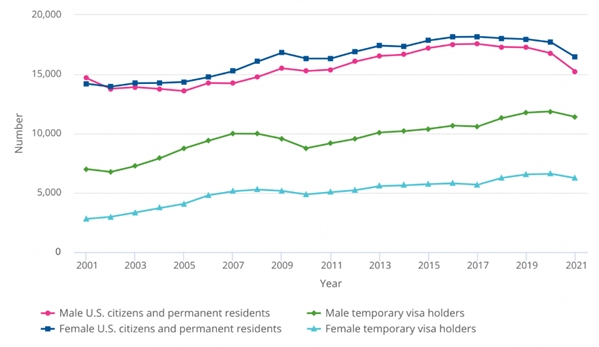 2021年的博士学位获得者中,美国公民和永久居民有31674人,减少了8%;而临时签证持有者有17638人,减少了5%。(注:另有2938人为身份不明者)