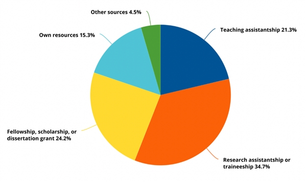 图表:经济支持分析。2021年,博士学位获得者最常见的财务支持来自研究助学金(research assistantships)和培训金(traineeships),占比为35%;有24%来自学院助学金 (Fellowship)、奖学金或论文资助;21%来自助教金;约 15%的博士学位获得者主要依靠个人资源,包括贷款、个人储蓄、个人收入以及其配偶、伴侣或家庭的收入或储蓄;5%依赖雇主报销和国外支持。