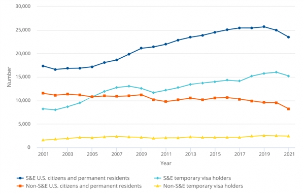 图表:2021年,持临时签证的S&E博士学位获得者有15216人,占S&E博士学位获得者总体的39%,比2020年减少了784人。