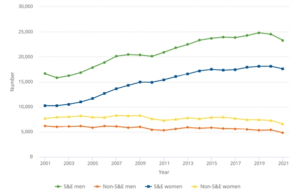 图表:过去20年,不管是男性还是女性,其数量增长主要集中在S&E领域。在S&E领域,男性一直多于女性,而非S&E领域,女性则多于男性。
