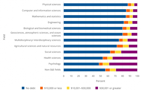 图表:博士生的债务。2021年,在物理学、计算机与信息科学、数学与统计学、工程学、生物与生物医学等领域,有80%到87%的博士学位获得者没有债务;而心理学、健康科学和非S&E领域博士没有债务的比例最低,其中心理学领域只有48%,且有38%的博士欠债超过3万美元。