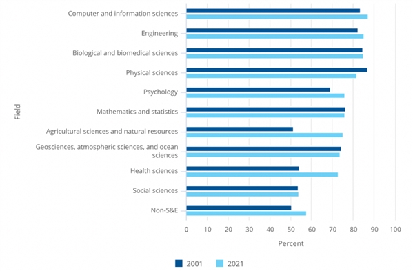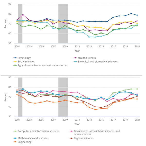 图表:S&E领域就业(包括博士后职位)前景更好。2021年,心理学博士就业率高达78.7%,计算机与信息科学达到历史最高,为78.3%,而工程学和农业科学与自然资源科学就业率较低,分别为67.8%和67.9%。