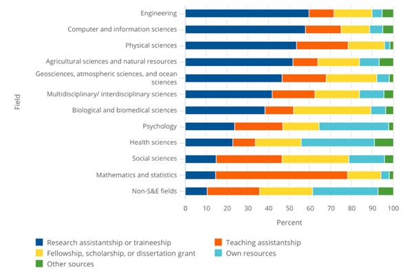 图表:这些经济支持因各领域而异。2021年,研究助学金是工程学、计算机与信息科学、物理学、农业科学和自然资源科学领域的主要经济支持;在数学与统计学领域,助教最为常见;而生物与生物医学领域则依赖学院助学金、奖学金或论文资助以及研究助学金或培训金。