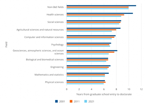 图片图表:各学科获得博士学位所需的年限。总体而言,非S&E领域需要更长的年限,2021年为10年,而这个数据在S&E领域中最长的是健康科学和社会科学,分别为8.8年和8.5年。物理学领域需要年限最短,为6年,数学与统计学需要6.2年,生物与生物医学为6.4年。