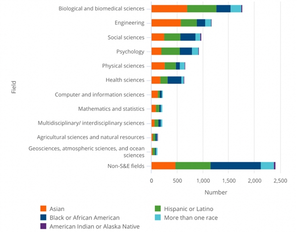 图表:各种族的学科偏好。2021年,在美国公民与永久居民的少数种族中,亚裔群体在计算机与信息科学、工程学、数学与统计学、物理学以及生物与生物医学中占据统治地位。非裔则在健康科学和非S&E领域(尤其是教育学)中有优势,而拉丁裔的优势学科是心理学、社会科学、农业与自然资源科学、地球科学、大气科学和海洋学。