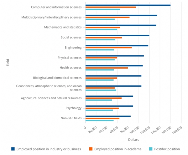 图表:对于工业界和非学术部门的博士学位获得者,其薪金预期高于博士后和学术界的薪金。大多数领域的博士后待遇中位数为5万美元到5.5万美元,而数学与统计学和计算机与信息技术领域是2个例外,其中位数待遇分别达到了6万美元和6.5万美元。计算机与信息技术领域中报告的最高中位数待遇为,学术界9.5万美元,工业界16万美元。