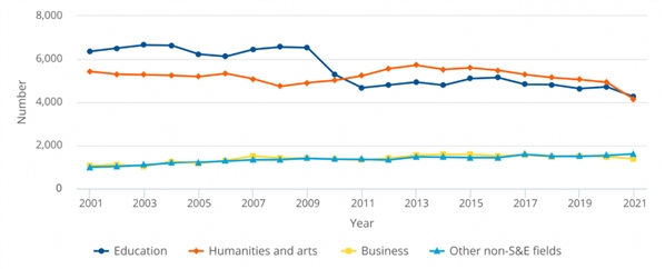 图表:过去20年来,在非S&E领域中,只有商科博士学位授予数量有增加,而人文艺术、教育学的数量都有下降。尤其是在2020年和2021年间,教育学人数减少了463人,人文艺术减少了787人。