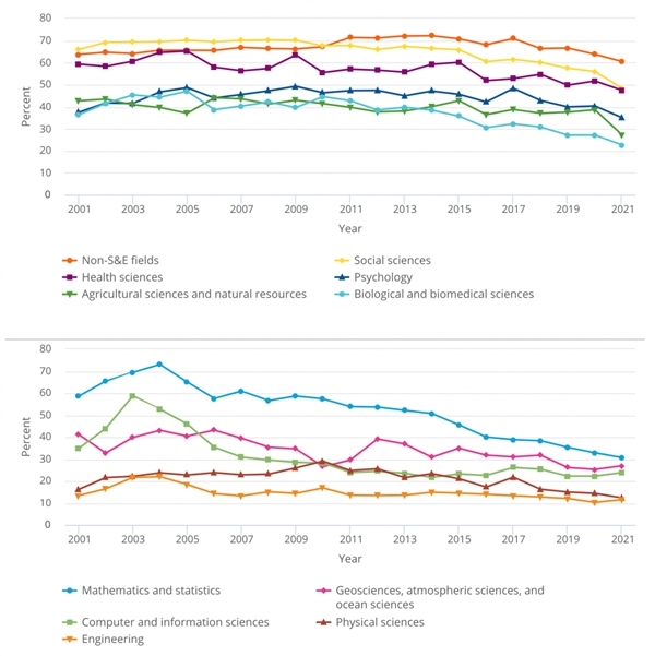 作为对比,在非S&E领域,2021年的女博士占比58%,这一比例自2000年以来变化甚微。不过,自2001年到2021年,非S&E领域的博士学位授予数量都有下降,女博士数量下降了14%,而男博士下降了22%。