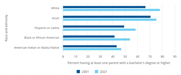 图表:美国公民和永久居民中,亚裔群体的父母表现一样很突出。在2021年,75%亚裔博士学位获得者的至少一位父母有学士或更高学位,而拉丁裔和非裔的这个比例为59%和54%。白人的这个数字为78%。
