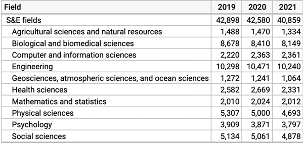 图表:对比2020年和2021年,所有S&E领域的博士学位授予数量均有下降,其中人数减少最多的是物理学(-307人)、健康科学(-338人)和生物与生物医学(-261人),减少最少的则是计算机与信息科学(-2人)和数学与统计学(-12人)。