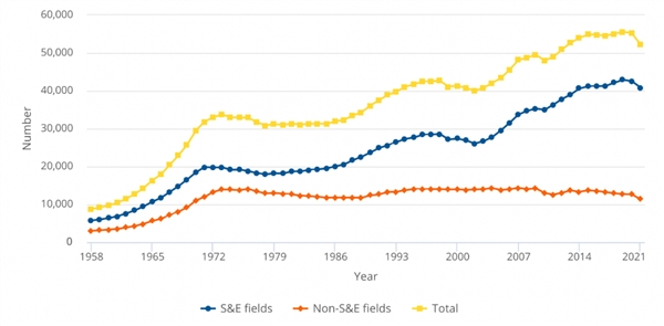 图表:美国高校历年授予的博士学位数量:1958-2021。在2021年,S&E领域的学位比例占到了78%。