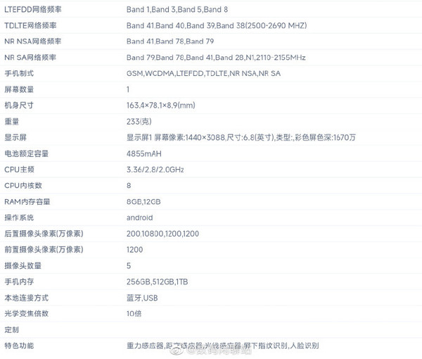 新机在相机上的配置有一些奇怪,前置1200W像素镜头相比上代的4000W像素甚至还有所下降,而后置四摄则采用了一亿像素主摄(108MP)+1200W+1200W+200W的规格,1200W像素双长焦还是10X光变,不过在一台近万元的安卓旗舰上,还能看到200W像素镜头的确是一件让人摸不着头脑的事情。