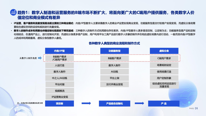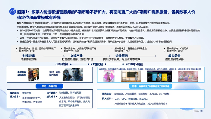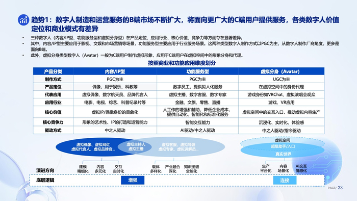 趋势1:数字人制造和运营服务的B端市场不断扩大,将面向更广大的C端用户提供服务,各类数字人价值定位和商业模式有差异