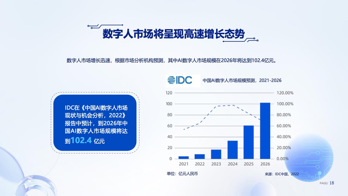 数字人市场增长迅速,根据市场分析机构预测,其中AI数字人市场规模在2026年将达到102.4亿元。