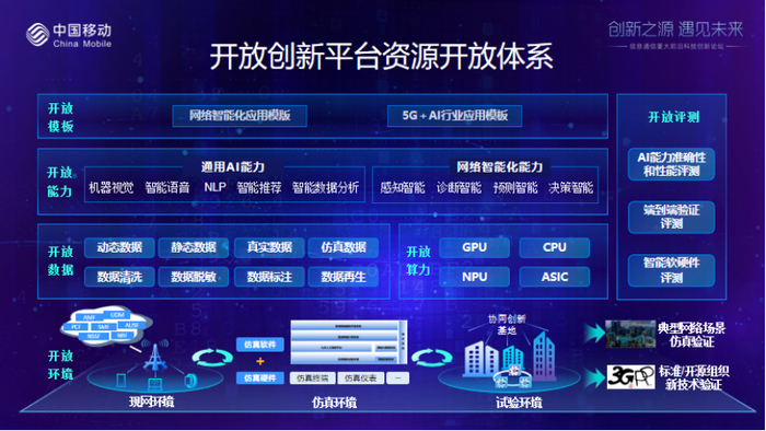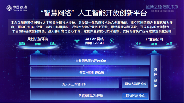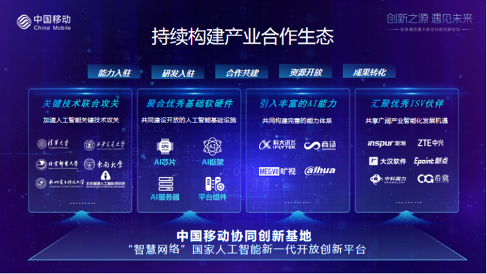 2022年10月,科技部正式批复支持中国移动建设智慧网络国家新一代人工智能开放创新平台。该平台以加速通信+人工智能关键技术融合突破、激发新一代信息技术融合创新动能、建立我国信息产业新优势为使命,面向广大ICT企业、高校、科研机构、行业组织等产业链上下游,提供柔性试验环境,开放充沛的智能算力、丰富的特色数据和算法、强大的开发与能力平台,赋能产业智能化技术创新,支持合作伙伴优秀成果规模化落地。