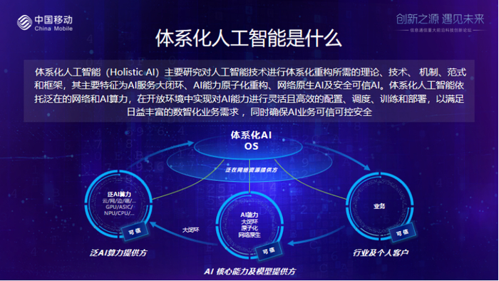 冯博士介绍,尽管大模型技术为人工智能带来了新的能力跃升,但人工智能仍面临应用落地边际成本居高、效率亟需提升、产业链协同不足等重大挑战,针对这样的挑战,中国移动提出了”体系化人工智能(Holistic AI)”原创技术,研究攻关对人工智能技术进行体系化重构所需的理论、技术、机制、范式和框架。体系化人工智能将依托泛在的网络资源和AI算力,在开放环境中实现对AI能力进行灵活且高效的配置、调度、训练和部署,以满足日益丰富的数智化业务需求,同时确保AI业务的可信可控安全。