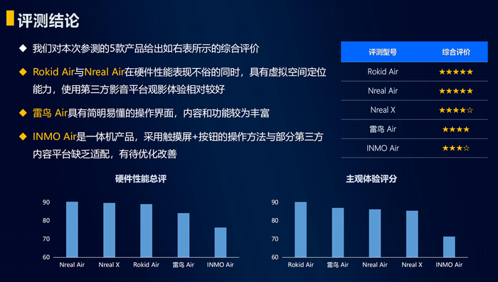综合来看,Rokid Air与Nreal Air在硬件性能表现不俗的同时,具有虚拟空间定位能力,使用第三方影音平台观影体验相对较好;雷鸟Air具有简明易懂的操作界面,内容和功能较为丰富;INMO Air是一体机产品,采用触摸屏+按钮的操作方法与部分第三方内容平台缺乏适配,有待优化改善。