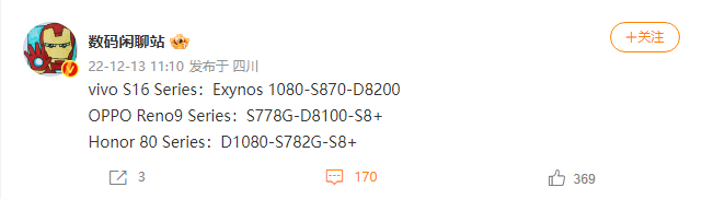 数码博主 @数码闲聊站 今日透露,vivo S16 系列包括三款机型,分别搭载三星 Exynos 1080、高通骁龙 870 以及联发科天玑 8200 芯片,并将其与 OPPO Reno 9 系列以及荣耀 80 系列进行了对比。