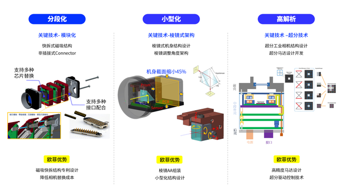 除了具备 130 万像素黑白工业相机等常规品的研发量产能力,欧菲光通过平移摄像头领域关键技术优势,重点研发模块化设计方案、棱镜式架构设计方案、影像模块侧边芯片移动平台设计方案,实现差异化产品设计,并成功申请专利。