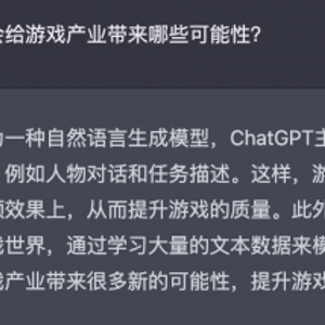 它给出的答案是:“作为一种自然语言生成模型,ChatGPT主要可以帮助游戏开发人员更快地创建游戏的文本内容,例如人物对话和任务描述。这样,游戏开发人员就可以将更多的精力放在游戏的视觉和音频效果上,从而提升游戏的质量。此外,ChatGPT还可以帮助游戏开发人员创建更丰富的游戏世界,通过学习大量的文本数据来模拟复杂的人物关系和情感。总之,ChatGPT可以为游戏产业带来很多新的可能性,提升游戏的质量和丰富性。”