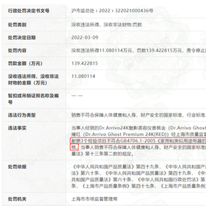 据行政处罚决定书显示,当事人经销的Dr.Arrivo 24K魅影美容仪香槟金产品和Dr.Arrivo 24K魅影美容仪奢华耀红产品,经上海市质量监督检验技术研究院检验,标志和说明、结构、耐热和耐燃3个检验项目不符合GB4706.1—2005《家用和类似用途电器的安全第1部分:通用要求》标准,被判定为不合格。