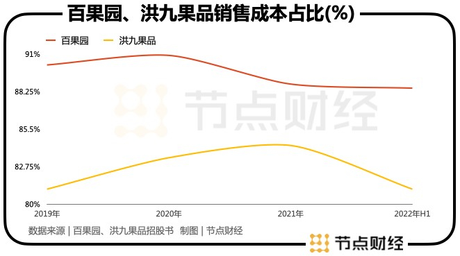 数据显示,2019年、2020年、2021年以及2022年上半年,百果园的销售成本(包括已出售存货成本、运输费用、僱员福利开支及其他成本)占总营收比重分别为90.2%、90.9%、88.8%和88.5%。其中,存货销售成本(主要为水果采购成本)分别占销售成本的96.2%、95.2%、95.3%和95.3%;运输费用分别占销售成本的1.6%、2.4%、2.2%和2.1%。