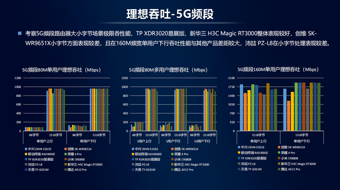 理想吞吐:考察路由器大小字节场景极限吞性能。2.4频段下,TP XDR3020易展版、新华三H3C Magic RT3000整体表现较好,创维 SK-WR9651X在大字节方面表现较好。5G频段下,TP XDR3020易展版、新华三H3C Magic RT3000整体表现较好。