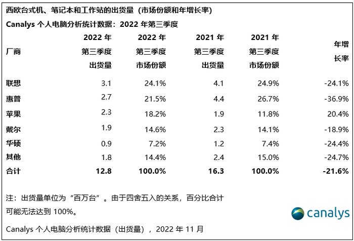 Canalys:2022年第三季度西欧笔记本电脑、台式机和工作站出货量跌至 1280万台